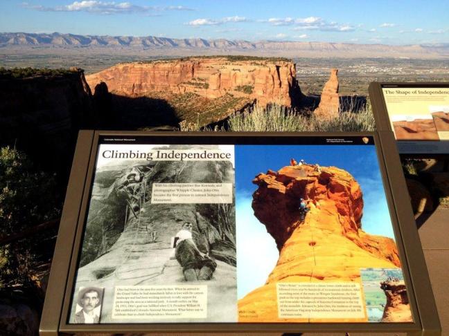 A modern-day climber is featured on the sign as well—yours truly—making her way up to the capstone of the 450-foot rock tower, in Grand Junction, Colorado. Photo by Stewart M. Green